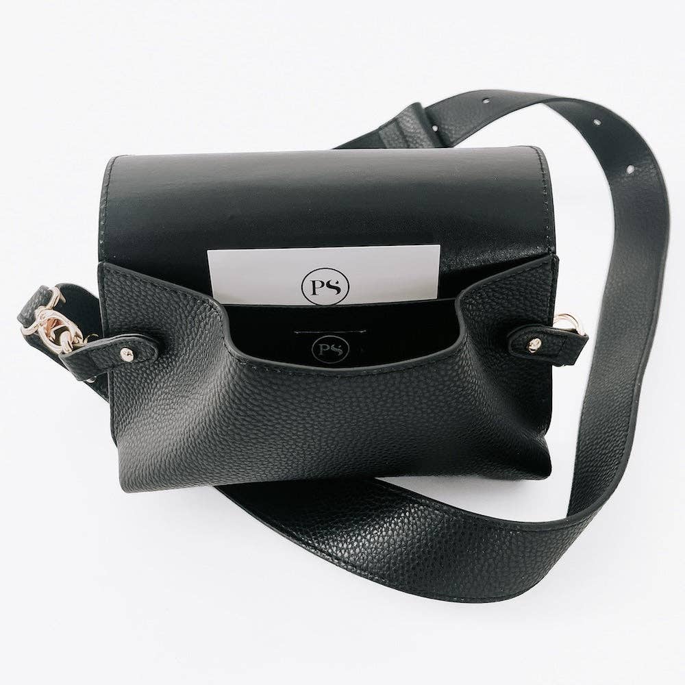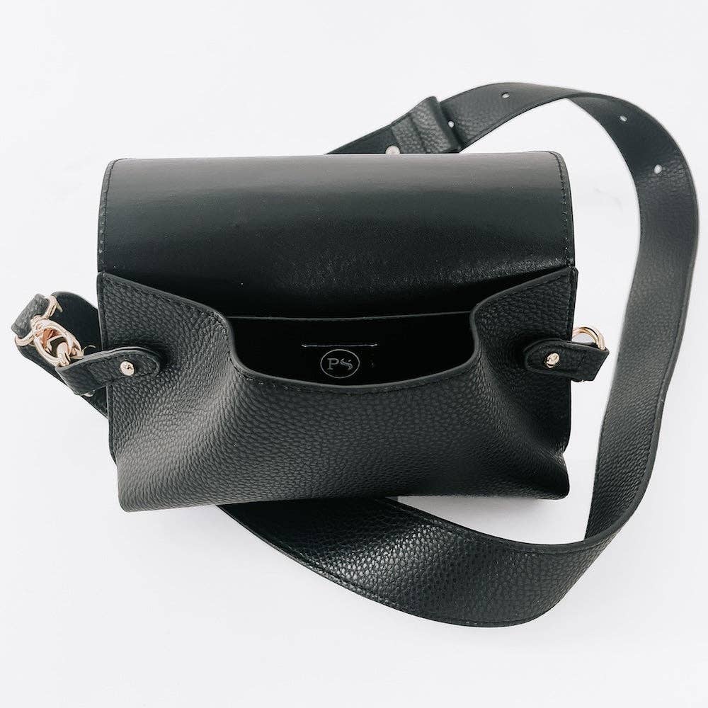 Meet your new everyday essential—the Khloe Vegan Leather Crossbody in classic black. This stylish and versatile bag features gold hardware, a snap front closure, an interior card pocket, and plenty of room for all your essentials. The adjustable strap allows for the perfect fit, making it ideal for day-to-night wear. It measures 7.5" L x 2" W x 5" H with a strap length of 38–47" and is crafted from durable vegan leather.