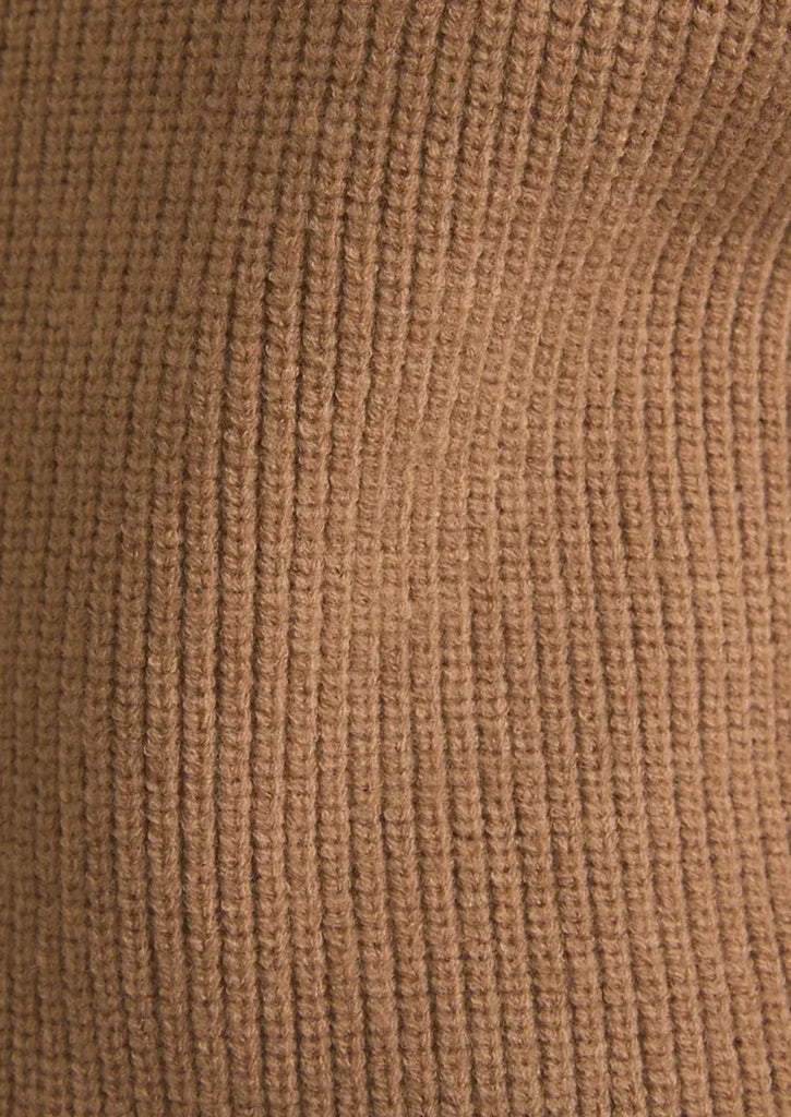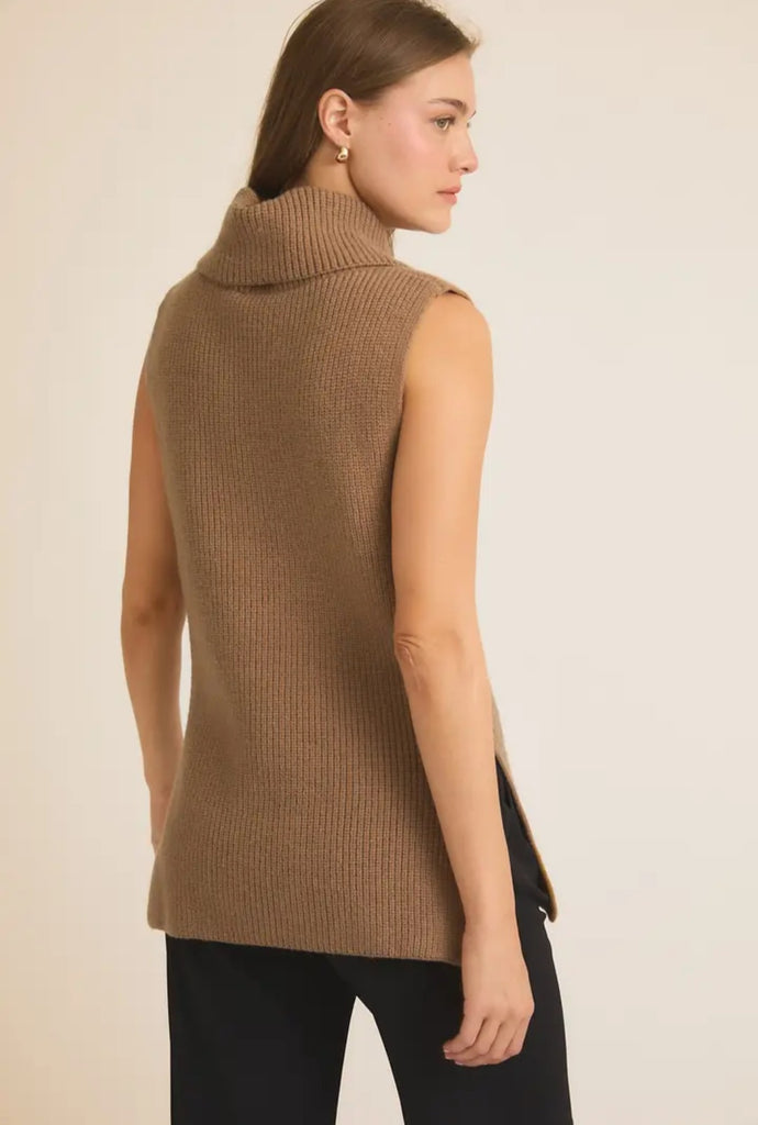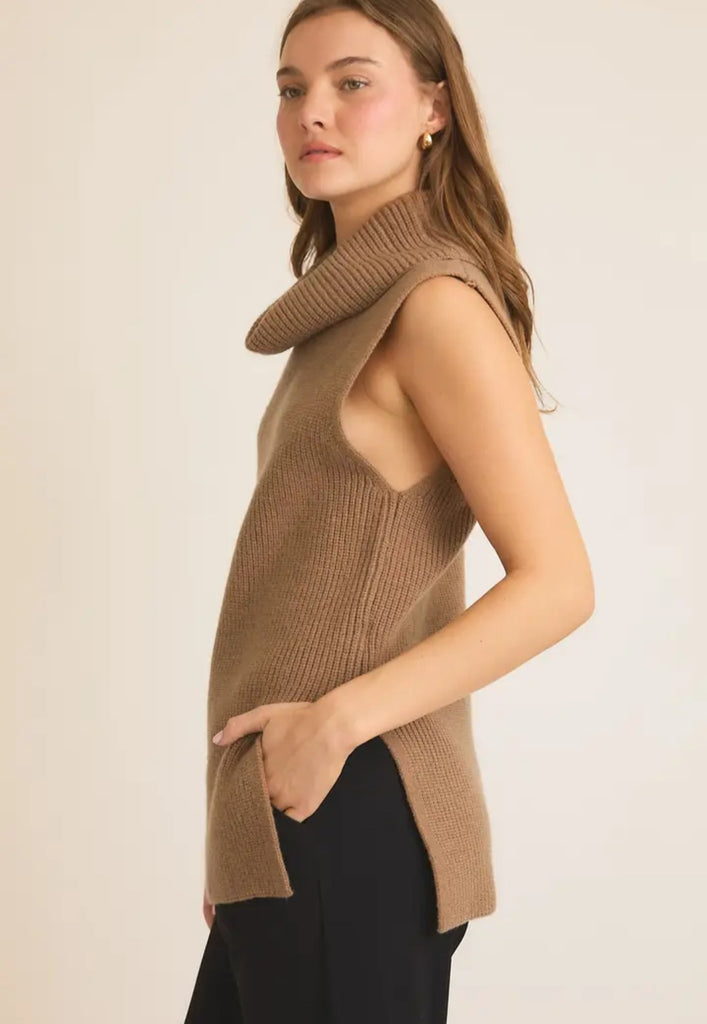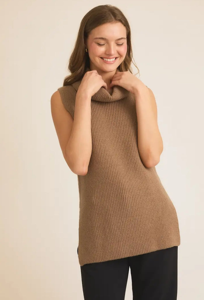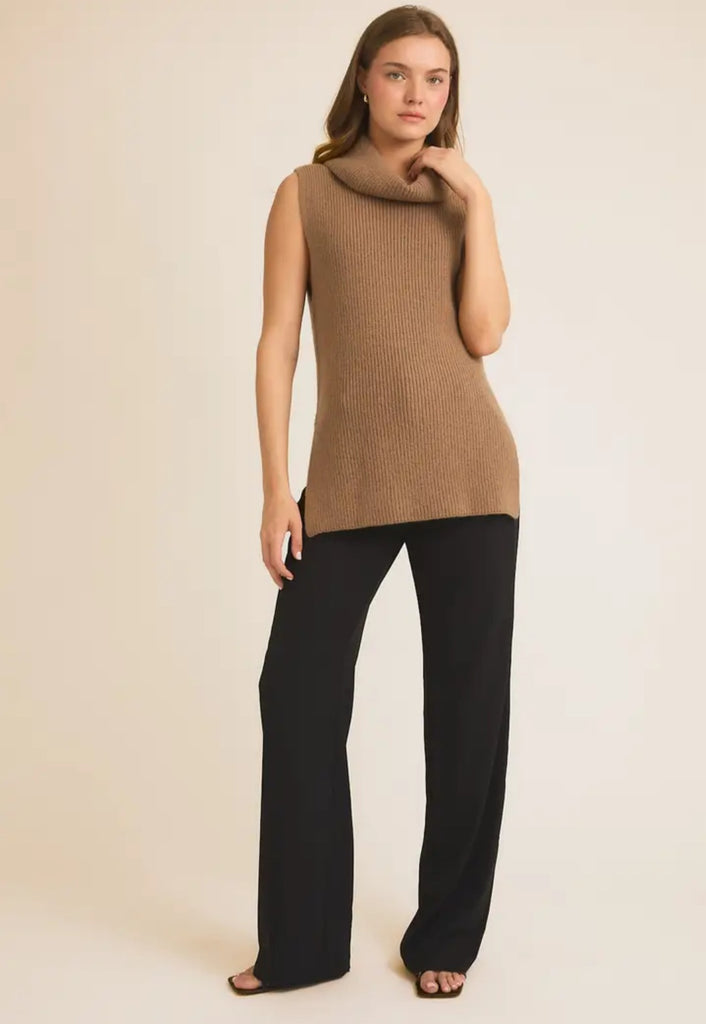 This sleeveless chunky turtleneck in camel offers a chic, longer length with stylish side slits for added movement. The dramatic oversized collar adds a bold, fashionable touch, making it the perfect statement piece for your wardrobe. perfect with denim, or our faux leather pant or legging, also layer with our cropped tee in cream for added warmth. A perfect staple for your winter wardrobe.