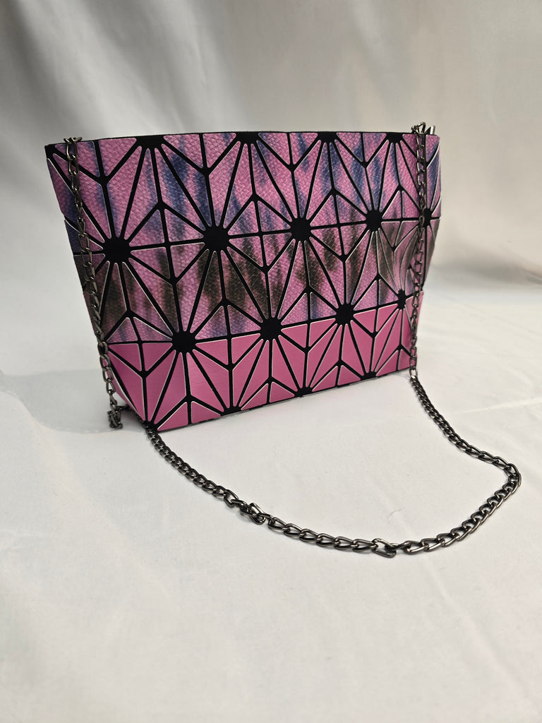 Add a pop of color to any outfit with this mid-sized geo tie-dye clutch. Featuring a playful pink and green design, it’s the perfect accessory to bring a fun, stylish touch to even the simplest looks!