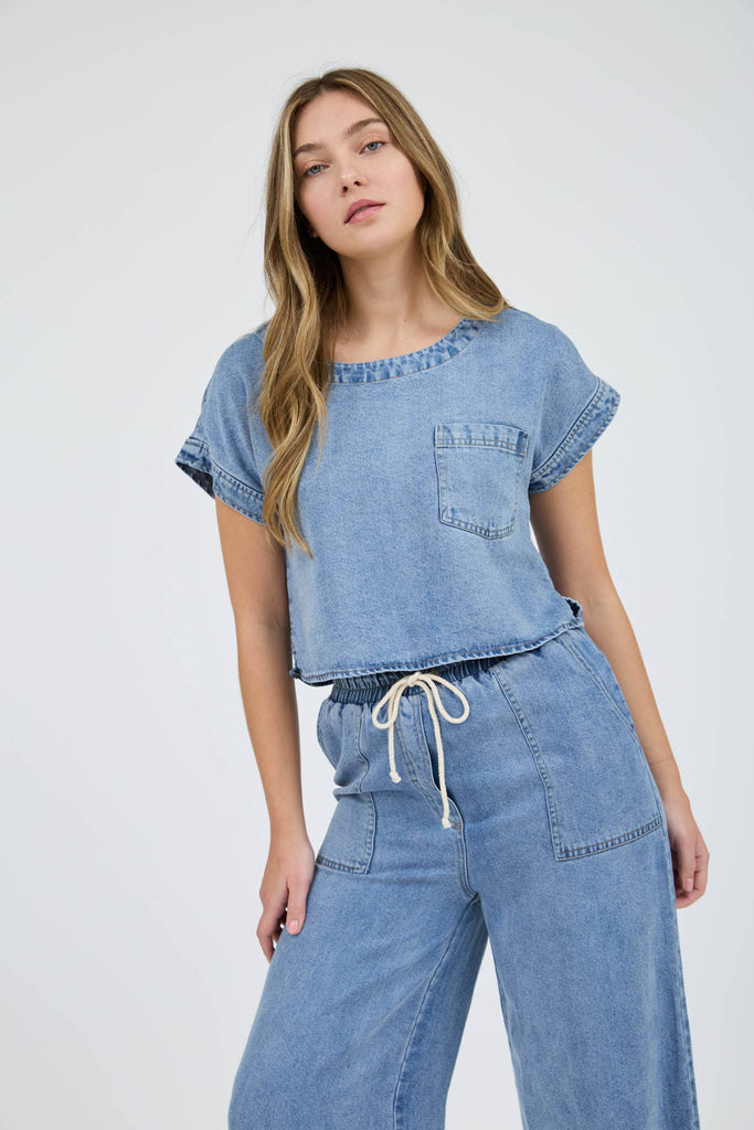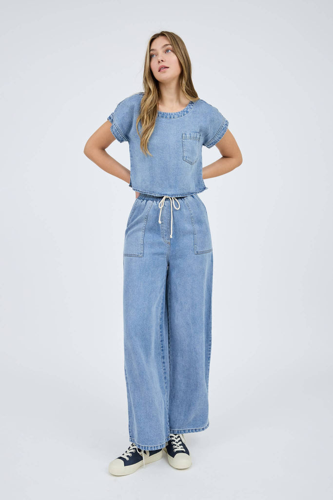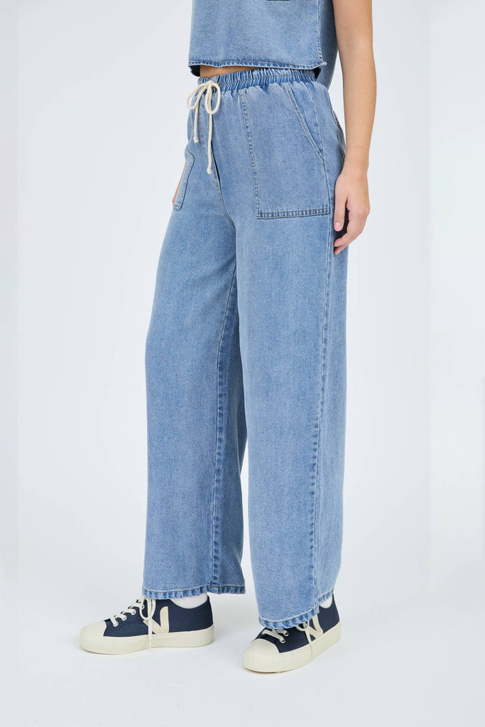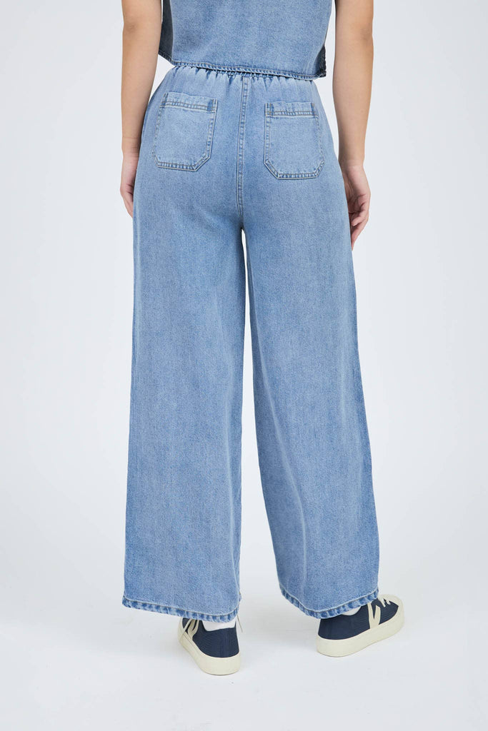 These high-waist chambray pants feature an elastic waistband with a self-tie detail and large pockets for added convenience. The wide-leg design offers comfort and style, while the 100% lyocell fabric ensures a soft, breathable feel. Lined