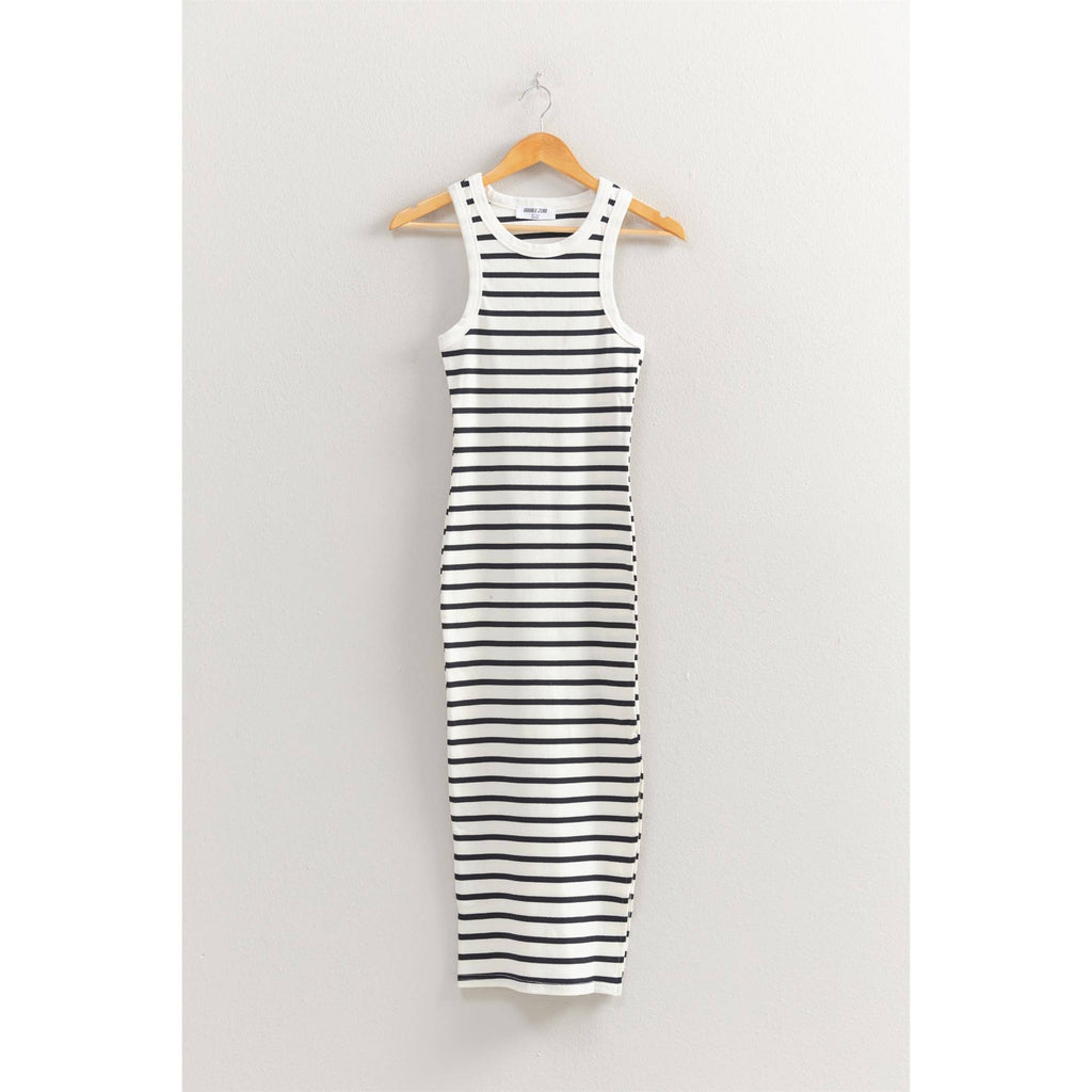 Get Major Style Points Whenever You Wear This Midi Dress. Covered In A Striped White & Black Pattern, This Dress Features A Crew Neckline And A Sleeveless Cut. The Dress Forms A Bodycon Fit And Ends In A Maxi Hem. 94% Cotton 6% Spandex Model Is 5' 8" Tall, 32" Chest, 25" Waist, 35" Hips And Wearing A Size Small