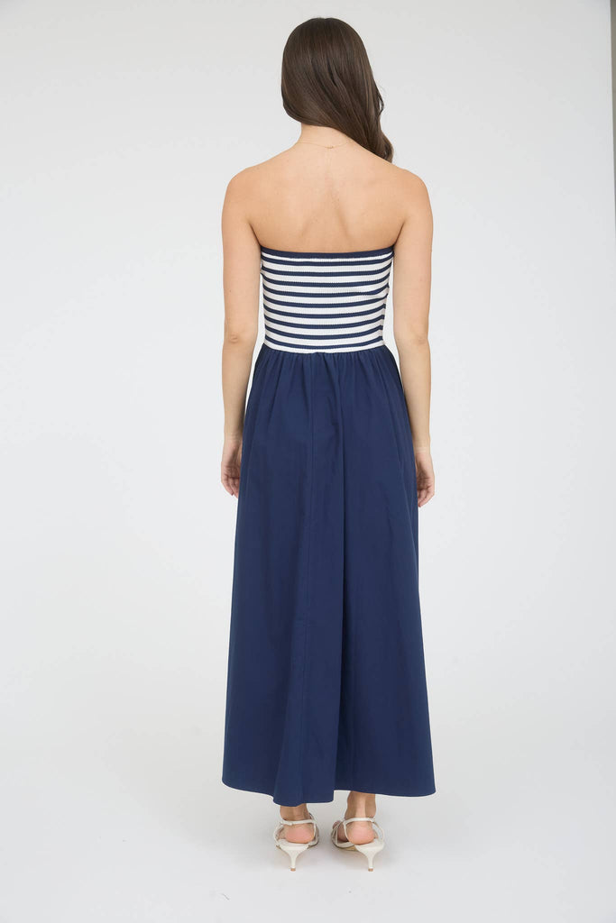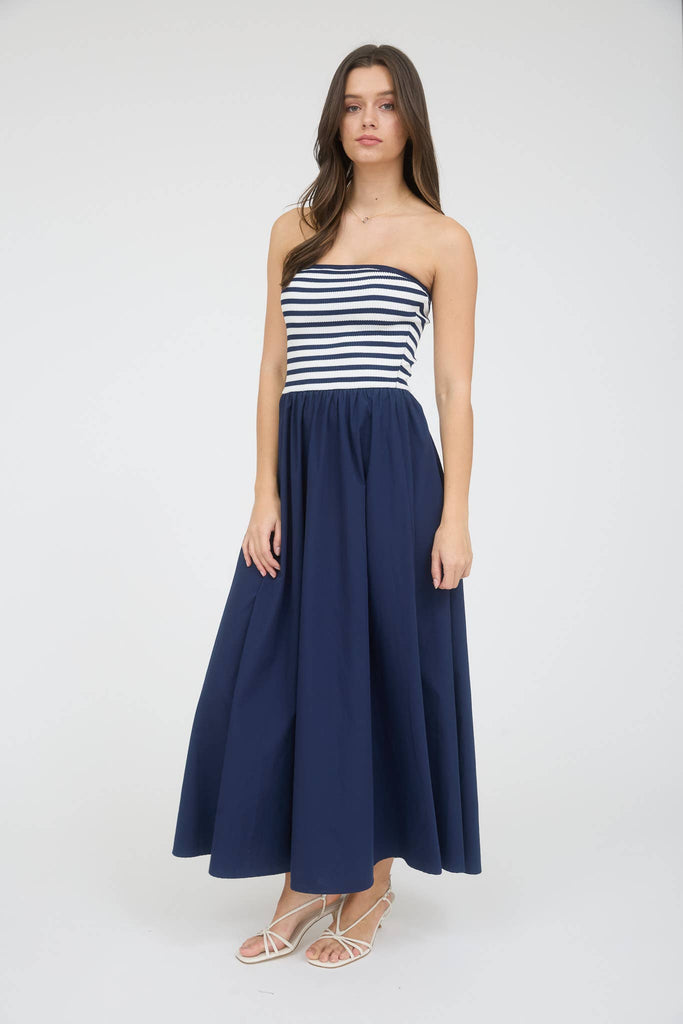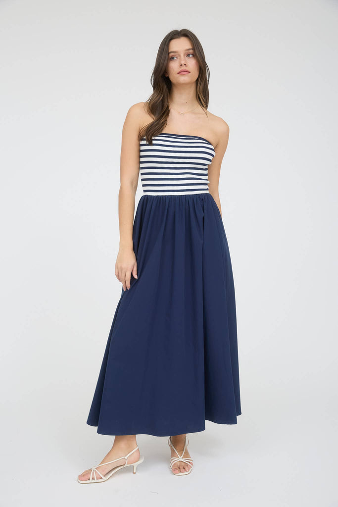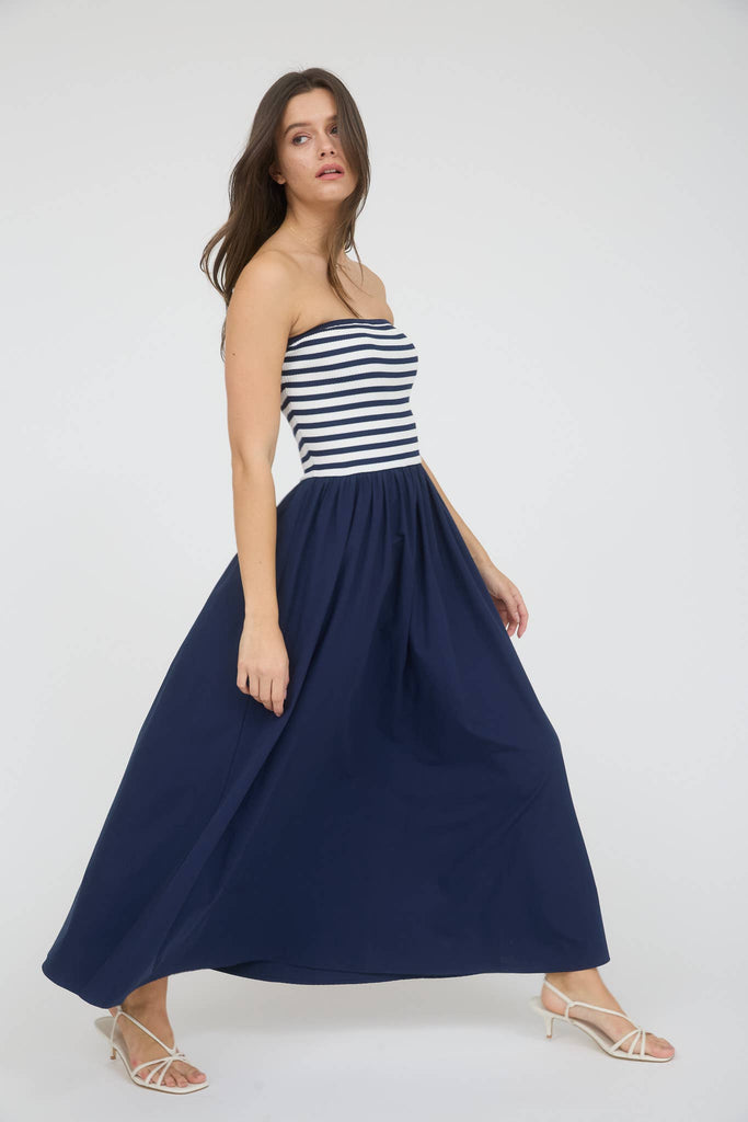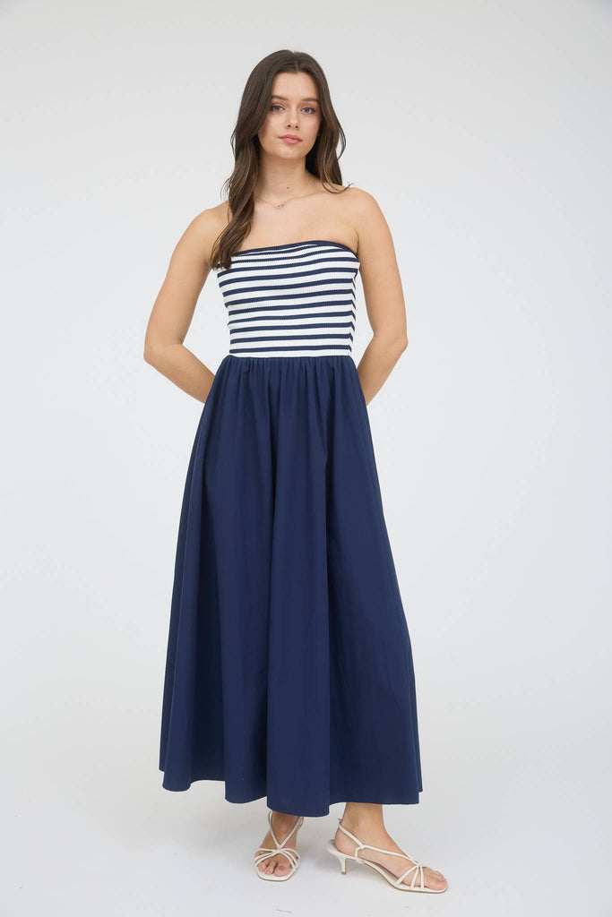 This striped tube midi dress features a comfortable elastic band at the top and a flattering A-line silhouette. The mixed media design combines a soft knit top with a lightweight woven skirt, making it perfect for warm days or easy layering. Made from a blend of viscose, polyester, and cotton, it’s unlined for a breathable feel and effortless style. True to size