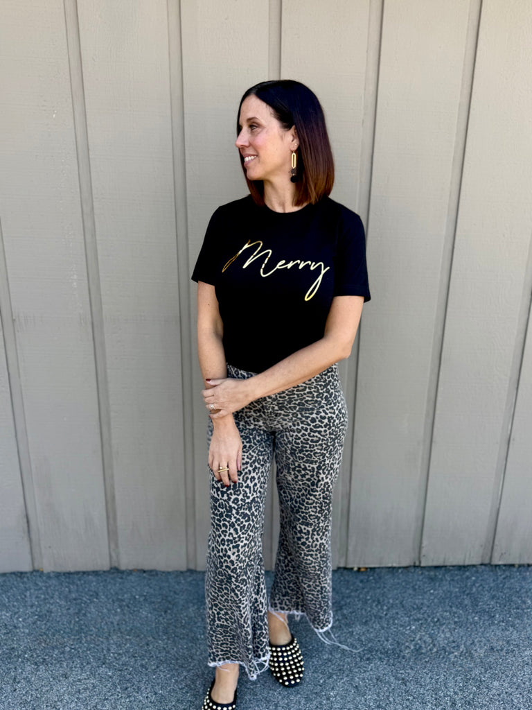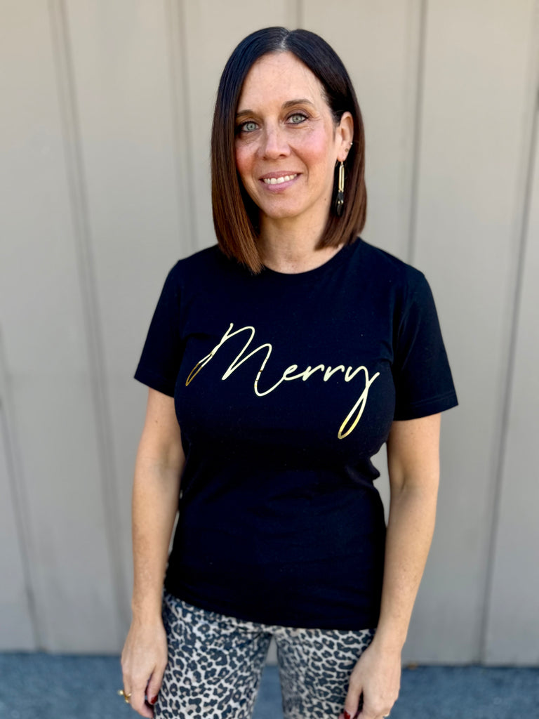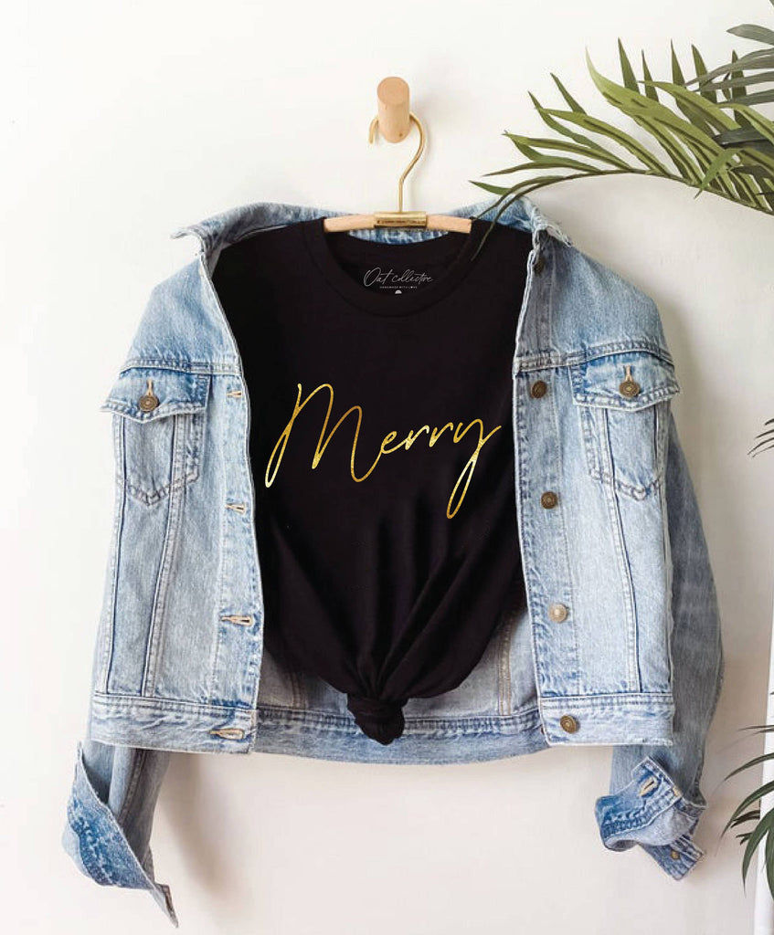 Shine bright this season with the MERRY FOIL Graphic T-Shirt. Featuring a festive foil print, this tee is made from 100% cotton for solid colors and a soft 52% cotton / 48% polyester blend for heather options. Each shirt is hand screen-printed and made to order, giving you a unique, high-quality piece perfect for celebrating in style.