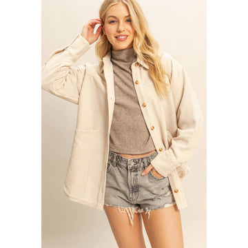 This timeless outerwear features a structured silhouette with a pointed collar and prominent front pockets, making it an ideal choice for layering over casual ensembles. The corduroy texture enhances the tactile appeal, offering a stylish solution for chilly evenings or transitional weather. Pair with slim jeans and ankle boots for a harmoniously stylish look, or throw over a dress to add a touch of sophistication to your daytime adventures. 97% polyester 3% spandex Model Is 5' 6" Tall, 32" Chest, 24" Waist, 32" Hips And Wearing A Size Small Imported. Designed In The USA