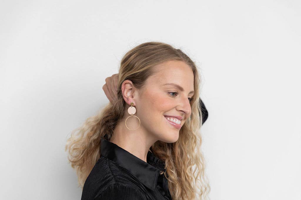Sadie is a statement dangle style that features a large gold charm for a hoop look! You'll get a perfect pop of color from the acrylic charms. -18k gold-plated stainless steel posts and charms -Lightweight and durable acrylic charms in Linen (with subtle rose gold shimmer)