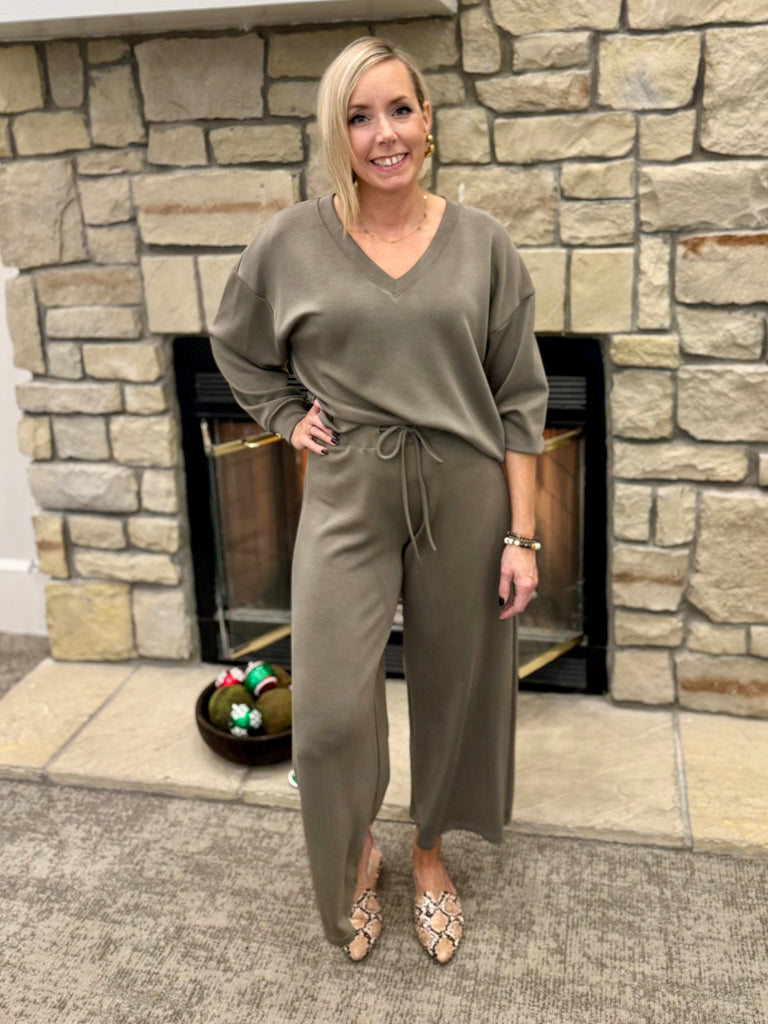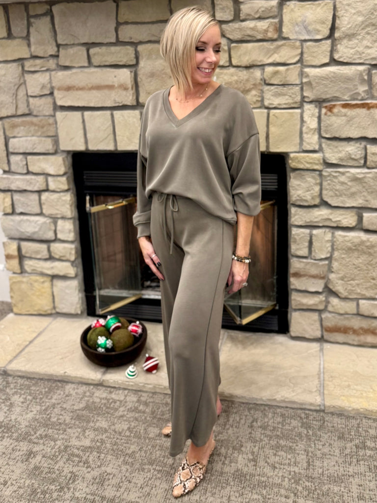 Effortless, elevated, and oh-so-comfy — our Scuba V-Neck Pullover brings a touch of laid-back luxury to your everyday wardrobe. Crafted from a smooth, stretchy scuba fabric, this top feels silky soft against the skin while holding its shape beautifully. The relaxed fit and flattering V-neckline make it perfect for layering or wearing solo, from cozy coffee runs to casual nights out. Pair with our scuba wide leg pant for a perfect set.