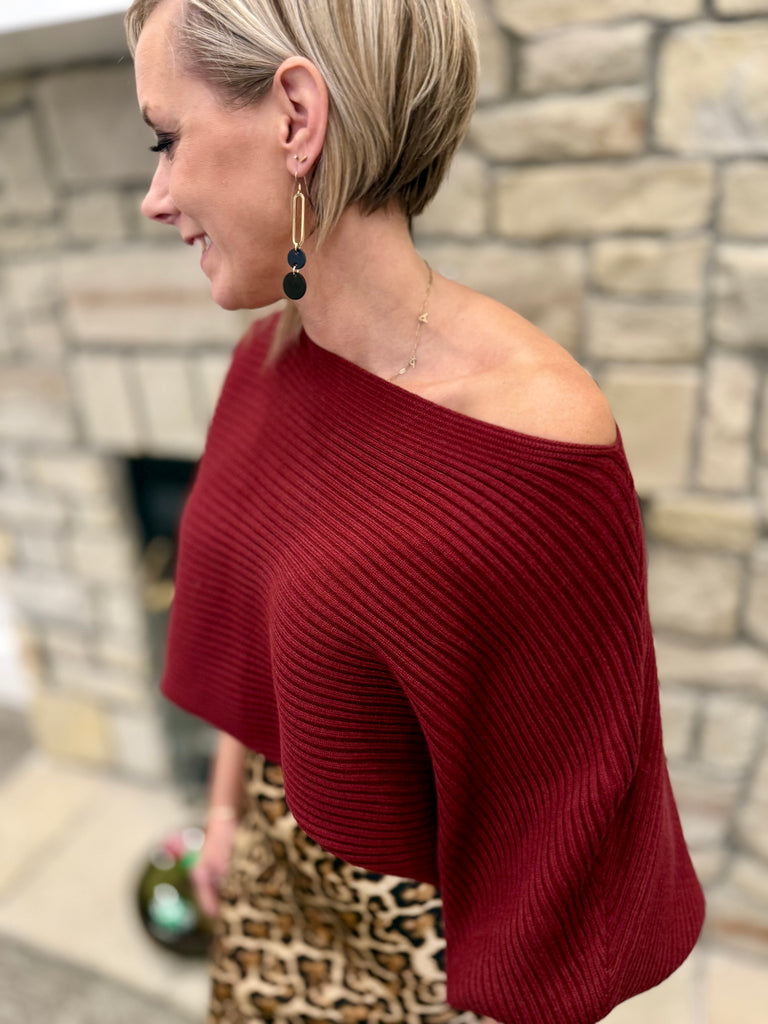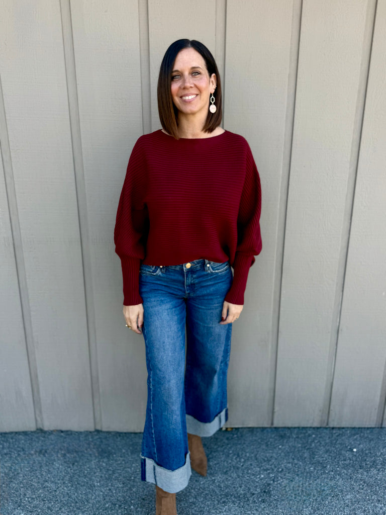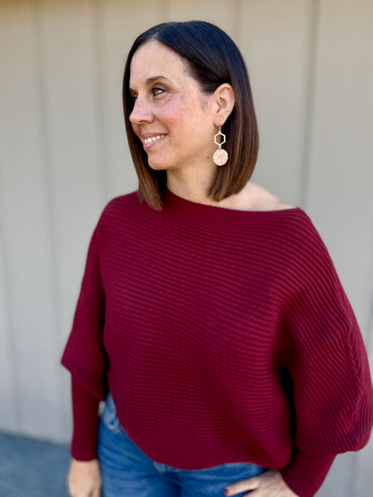 This elegant ribbed knit sweater features a classic boat neckline and dolman batwing balloon sleeves with ribbed hems for a relaxed, oversized fit, can be worn on or off the shoulder. Designed as a loose-fitting, boxy pullover, it offers soft, high-quality comfort perfect for casual wear, holidays, vacations, office days, or nights out. A versatile and stylish addition to any wardrobe.