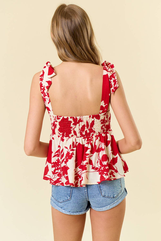 Features a bold, eye-catching red and ivory floral print for a standout look - Flattering baby doll silhouette with a relaxed, flowy fit. - Adjustable shoulder tie straps for a customizable and feminine touch - Square neckline adds a modern, chic vibe. STYLE MEASUREMENTS (SIZE SMALL) -TOTAL LENGTH 22 1/2" -BUST 16 3/4" -WAIST 15 1/4" 100%POLYESTER | LINING:100%POLYESTER MODEL IS 5'10" | BUST 34" | WAIST 24" | HIPS 35" WEARING SIZE S