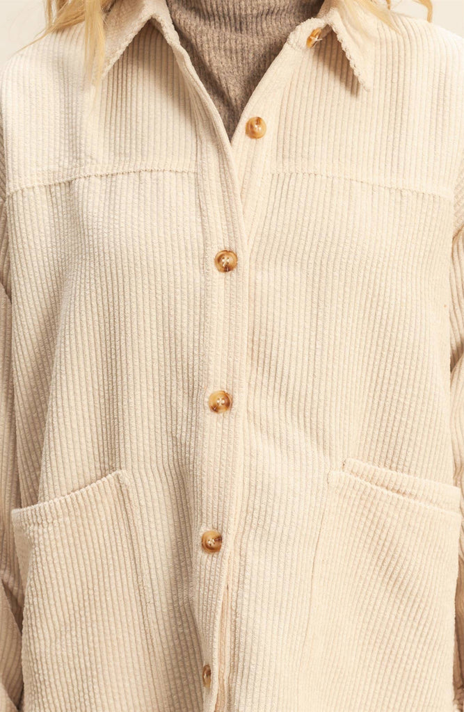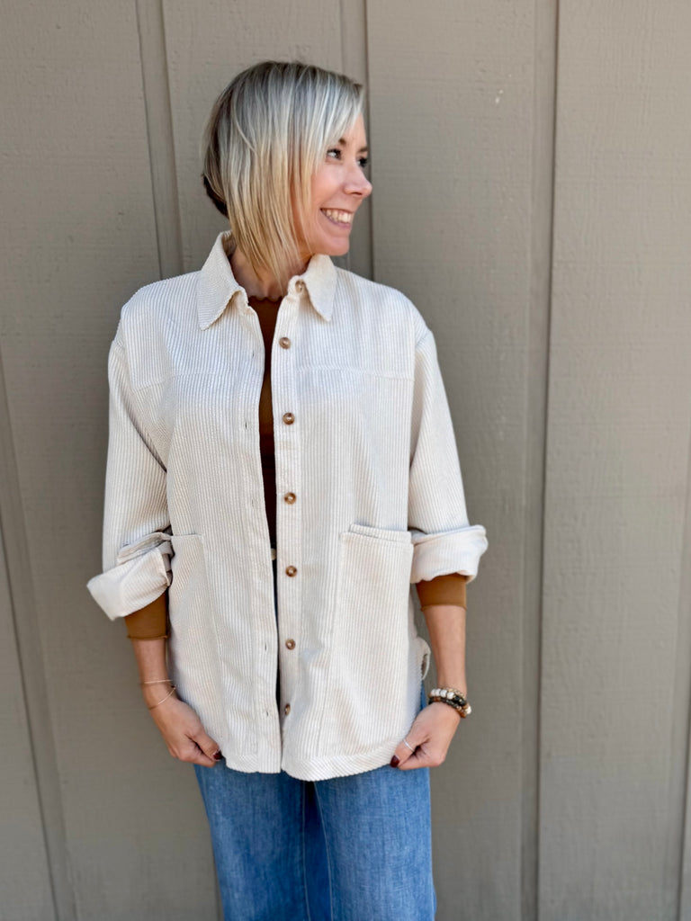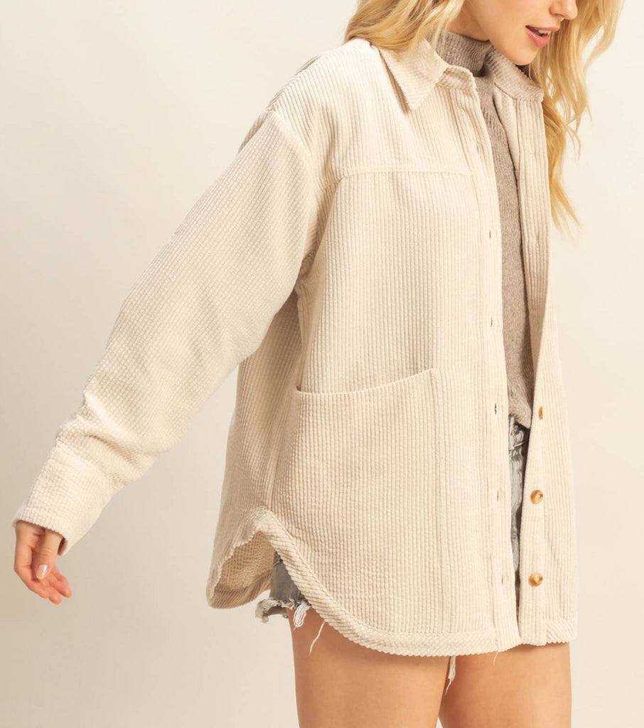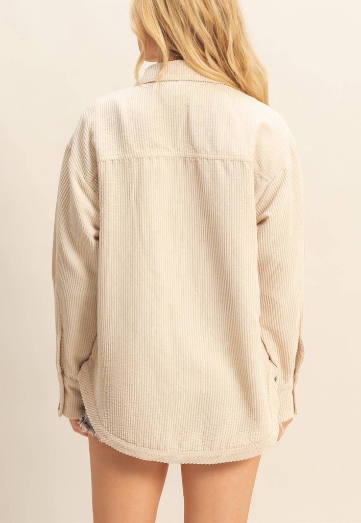 This timeless outerwear features a structured silhouette with a pointed collar and prominent front pockets, making it an ideal choice for layering over casual ensembles. The corduroy texture enhances the tactile appeal, offering a stylish solution for chilly evenings or transitional weather. Pair with slim jeans and ankle boots for a harmoniously stylish look, or throw over a dress to add a touch of sophistication to your daytime adventures. 97% polyester 3% spandex Model Is 5' 6" Tall, 32" Chest, 24" Waist, 32" Hips And Wearing A Size Small Imported. Designed In The USA