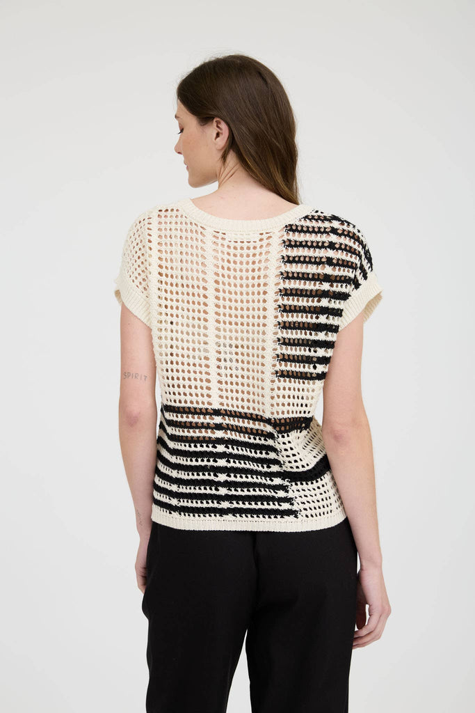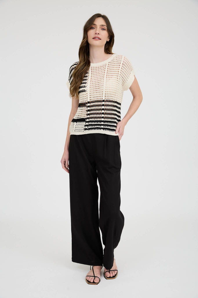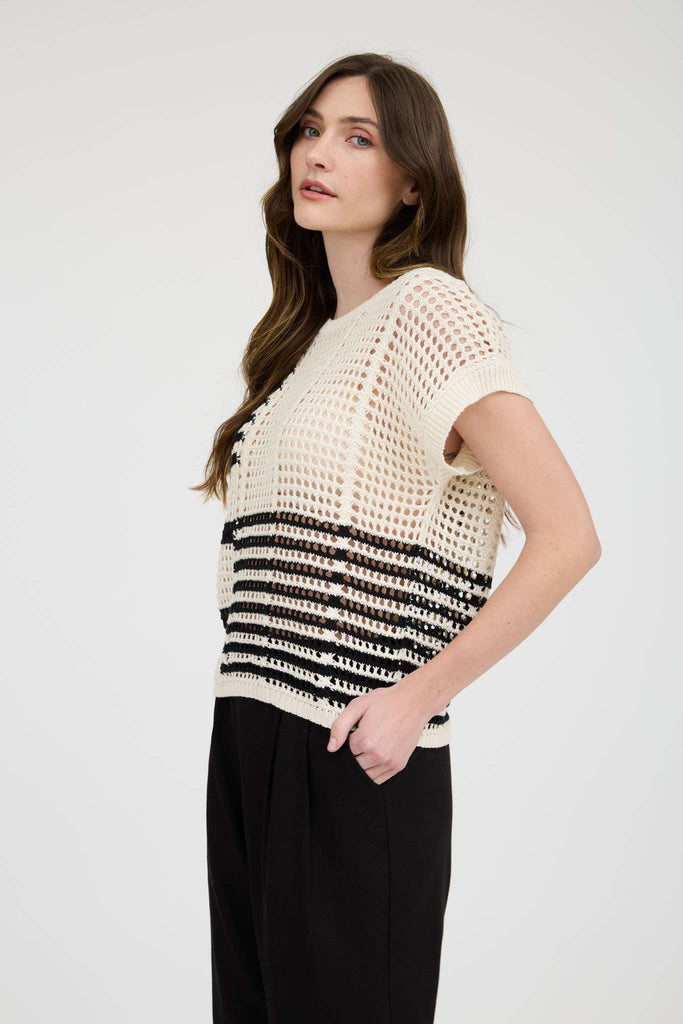 Stay effortlessly cool in this sheer crochet knit pullover sweater. Featuring a classic round crew neckline, short sleeves, and extended shoulders, this lightweight top is designed for a relaxed, easy fit. The black and ivory stripe pattern keeps it neutral and versatile, perfect for layering over a tank, bralette, or swimsuit. Made from 100% cotton, it’s breathable, soft, and ideal for warm-weather days.