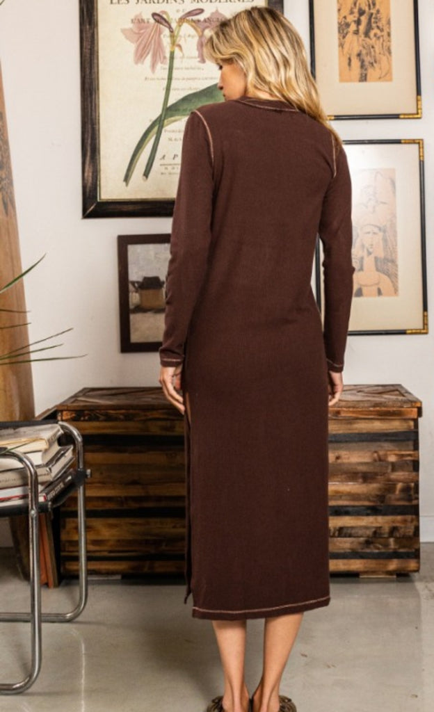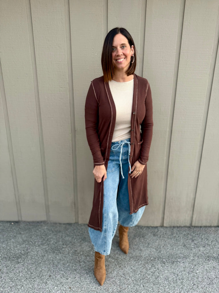 Introduce effortless elegance with our Mocha Rib-Knit Long Cardi. Designed in a rich chocolate brown, this piece features a flattering V-neckline, full button-down front, two front patch pockets, and tan contrasting trim detail for an elevated finish. The ribbed knit offers a soft, comfortable drape that extends into a longline silhouette with a side slit for modern ease. Whether layered over your favorite jeans or worn as a stand-alone outer piece, it brings relaxed sophistication to any look.