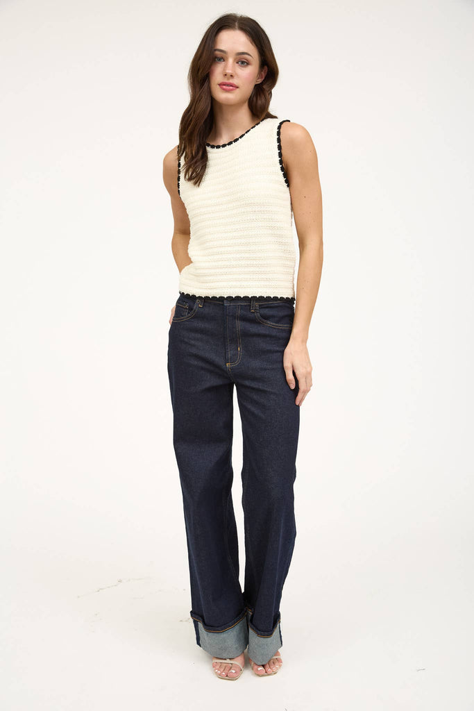 Elevate your wardrobe with this chic sleeveless crochet knit sweater top. Designed with a classic round neckline and eye-catching black contrast trim, this cropped pullover adds effortless style to any outfit. Made from 100% cotton for a breathable, lightweight feel, it's perfect for layering or wearing solo. Unlined for a relaxed, airy fit, this timeless piece pairs beautifully with high-waisted jeans, skirts, or shorts. Style it up or down for a look that’s both trendy and versatile!