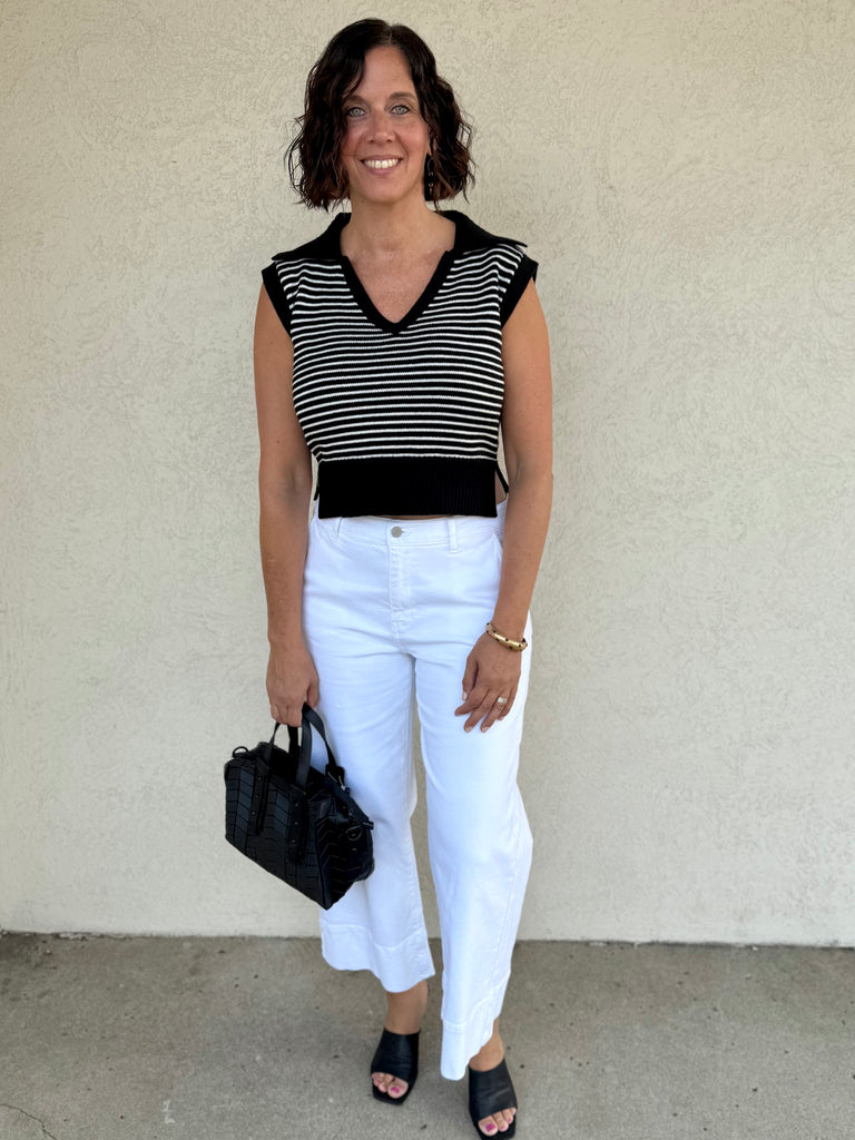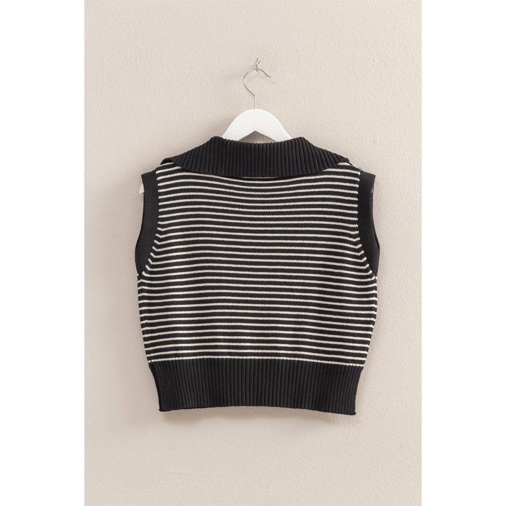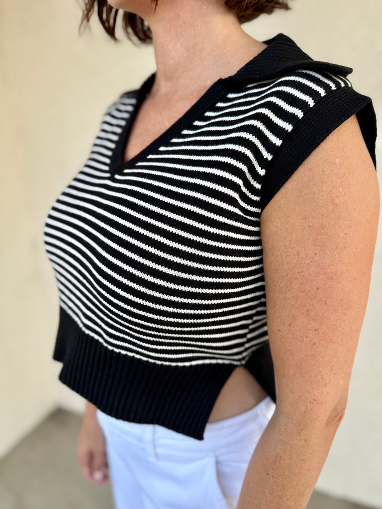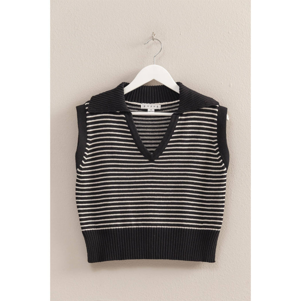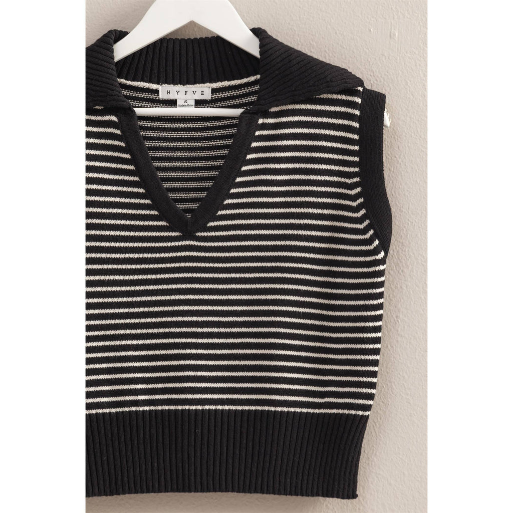This Knit Top Is Definitely A Wardrobe Staple Soft Knit Construction Shapes This Striped Top That Offers A Collared V-Neckline And Sleeveless Cut Bodice. The Top Offers A Relaxed Fit Before Ending In A Ribbed Hem. Model Is 5' 8" Tall, 30" Chest, 25" Waist, 35" Hips And Wearing A Size Small