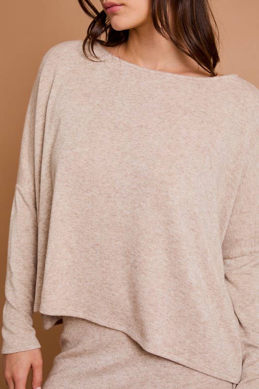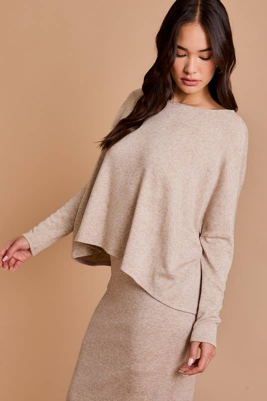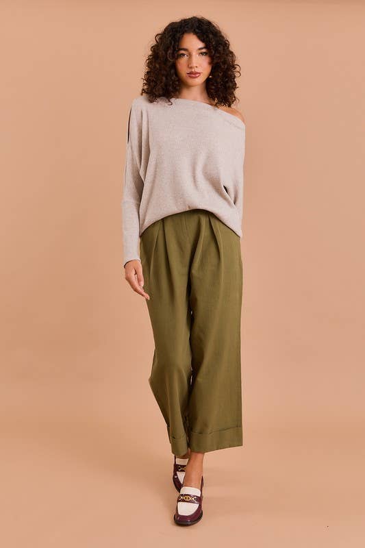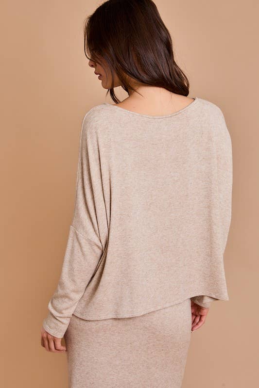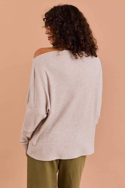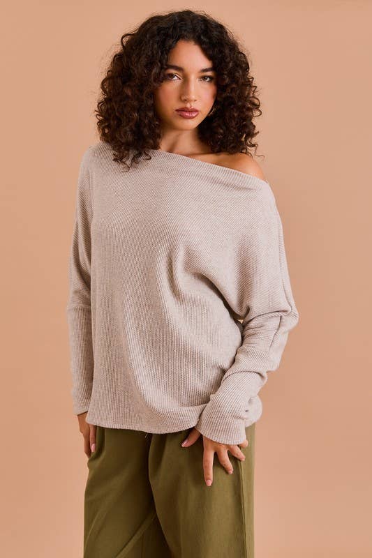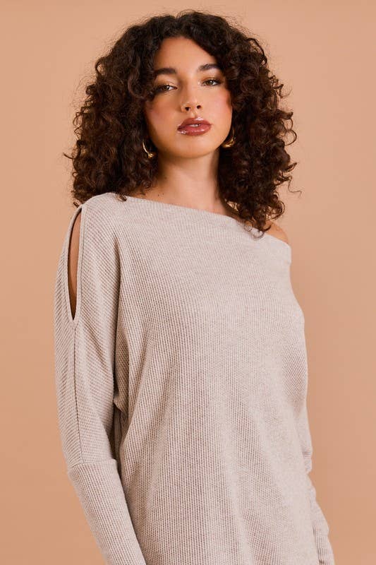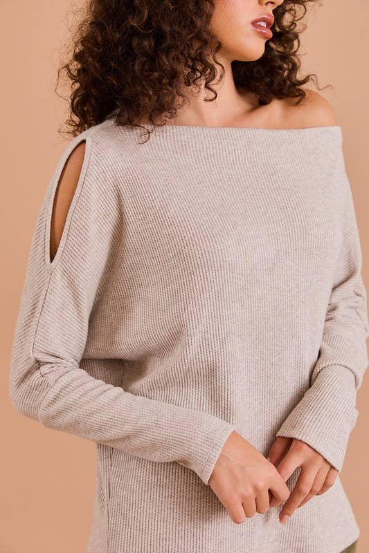 Elevate your style with our chic off-the-shoulder top in neutral stone color. Features trendy cut-out shoulders. This top boasts a sophisticated boat neck and long sleeves, perfect for any occasion. A contemporary essential for your wardrobe!