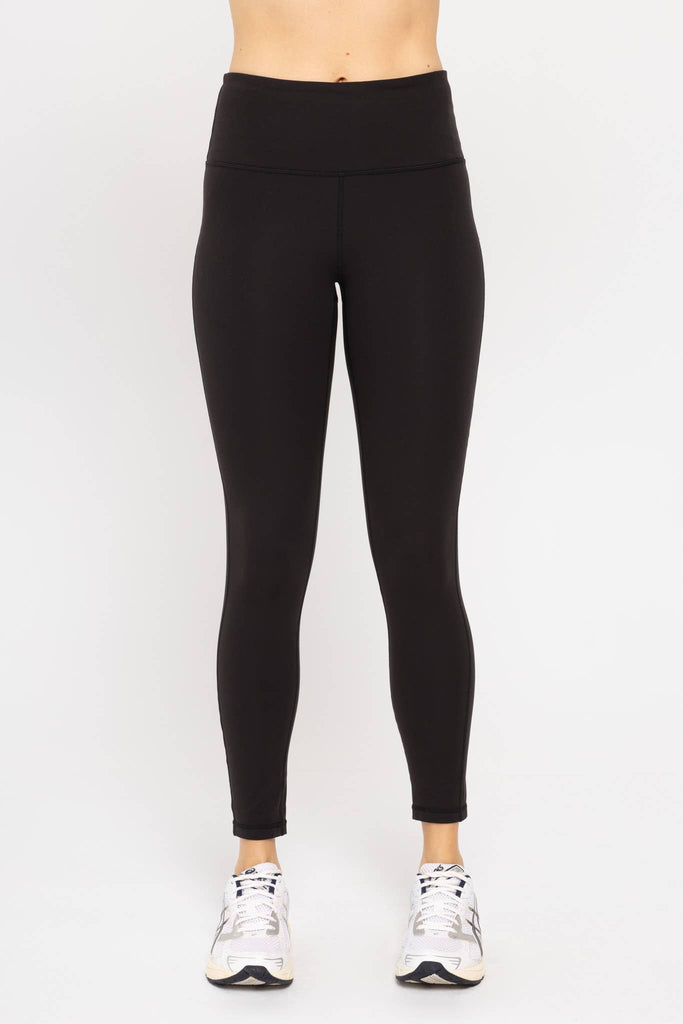 No side pockets, no back zippered pouch, just straight-up, essential full-length, eco-friendly leggings with high waistband for abs support and hidden pocket. Model is 5'9", a size 4, and is wearing an S. 80% recycled polyester, 20% spandex. Tummy control. Moisture-wicking. Four-way stretch.