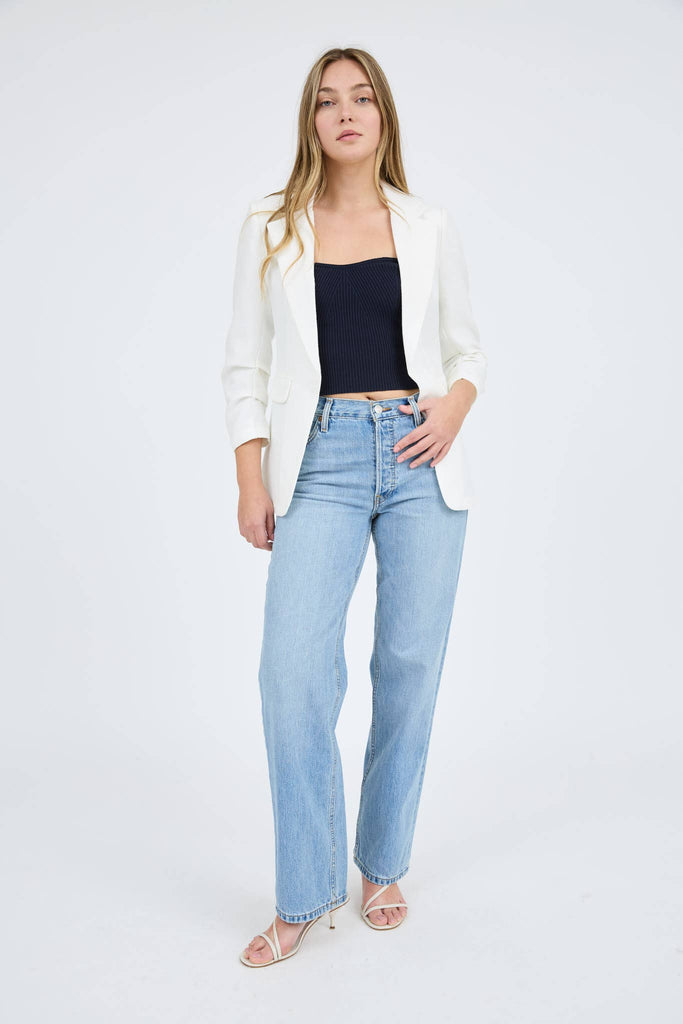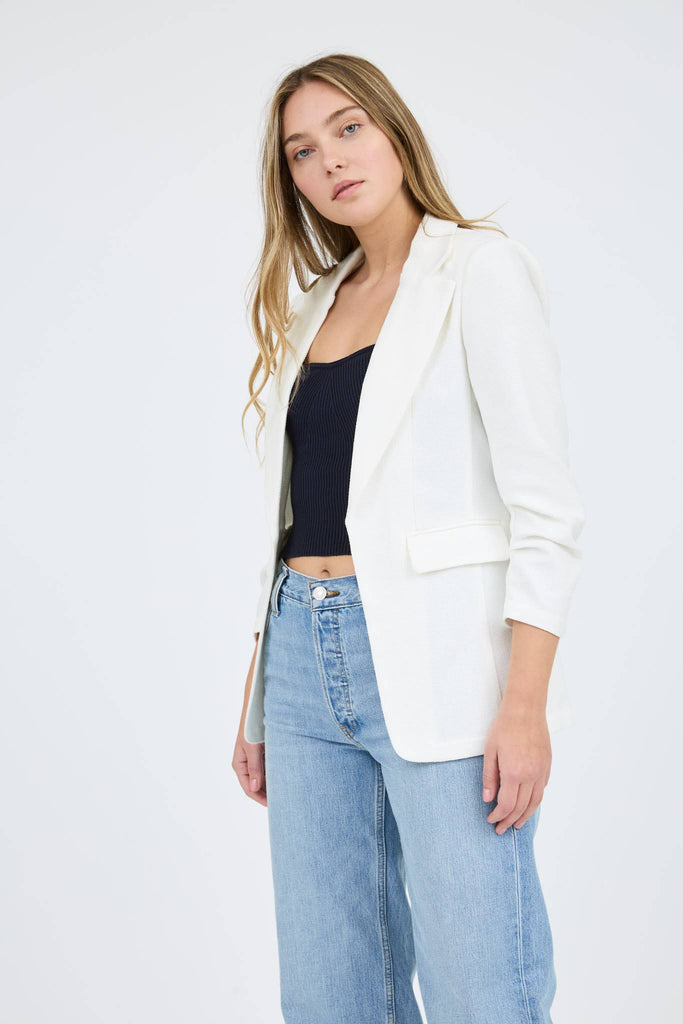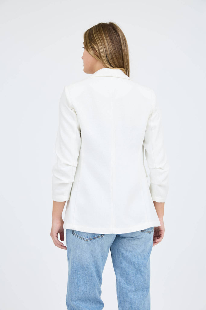 This chic white blazer jacket features a notch collar and an open-front design for a sophisticated yet relaxed look. The 3/4 ruched sleeves add a stylish touch, while the non-functional pockets keep the silhouette sleek. Made from 100% polyester, this unlined jacket offers a lightweight, breathable feel, perfect for layering over any outfit.