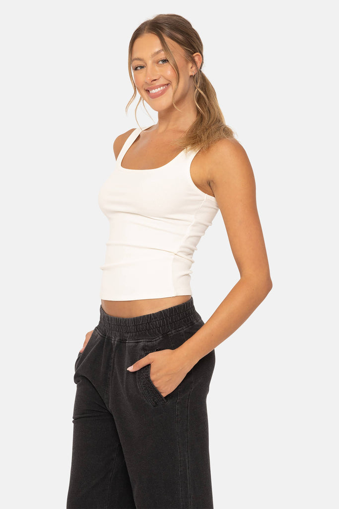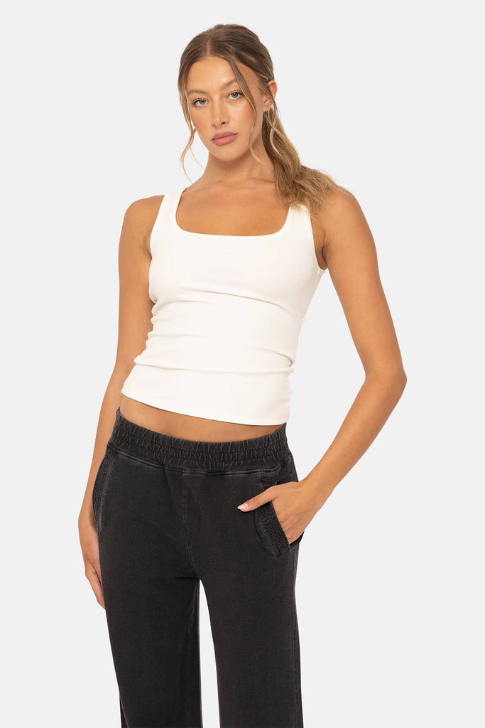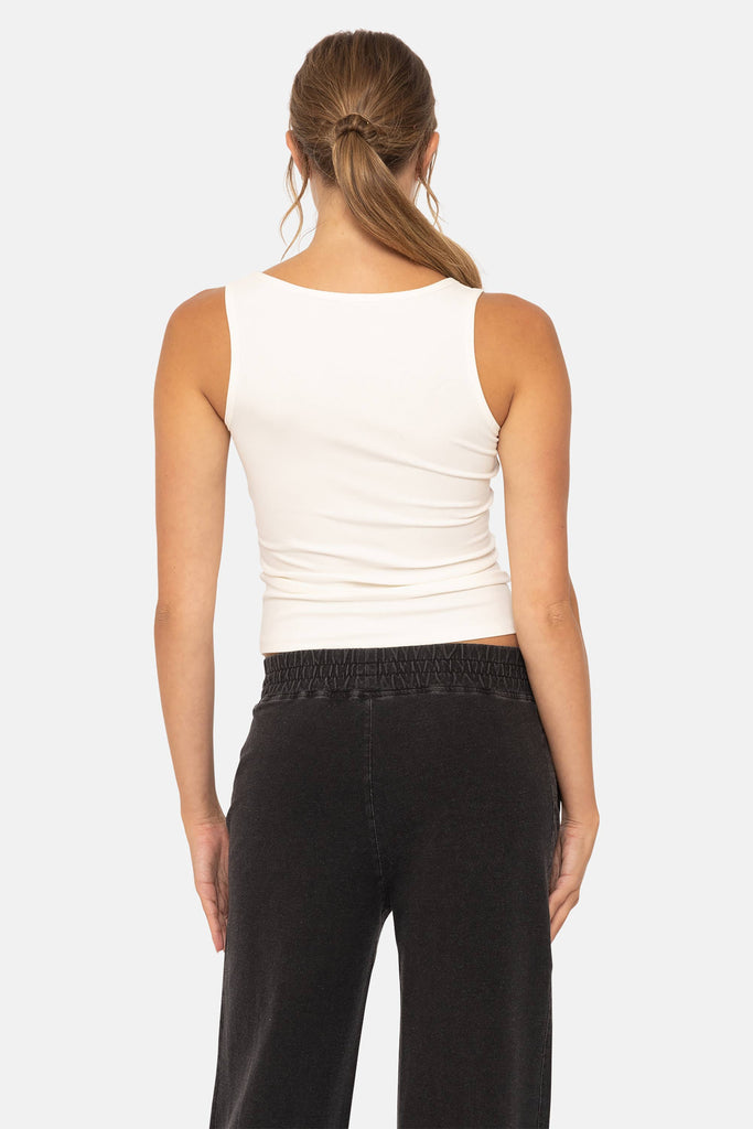 Made from a rayon blend for a soft touch, this classic off-white rib tank top is your next go to piece. The square neck and slim strap combination is ultra flattering and makes this piece perfect for layering. Model is 5'8", a size 4, and is wearing an S 93% rayon 7% spandex Four-way stretch.