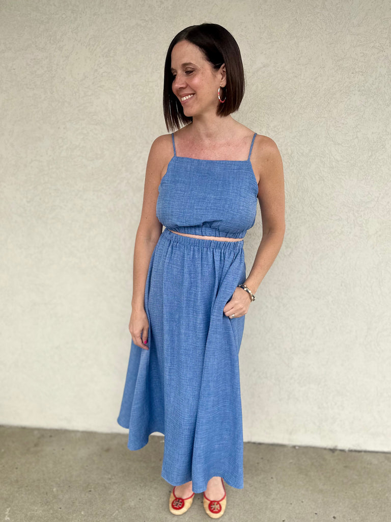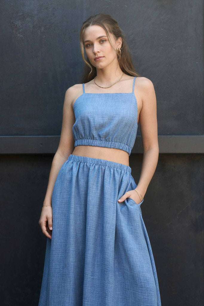 This solid woven crop top features a chic square neckline and sleeveless design, perfect for warm-weather styling. The elastic waist adds shape and comfort, while the full lining offers a smooth, structured fit. Made from lightweight polyester with a hint of stretch in the lining, it's an easy match for the coordinating skirt or your favorite high-waisted bottoms. True to size