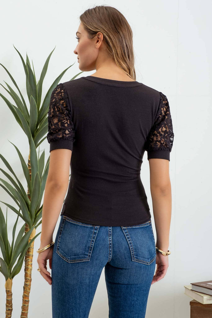 Elevate your everyday style with this chic Short Sleeve Lace Detail Knit Top. Featuring a half button-down design with a round neckline, it combines comfort and elegance effortlessly. The puff lace sleeves add a feminine touch, while the solid knit body offers a sleek look. Crafted from a blend of 93% polyester and 7% spandex for the body, and a contrast of cotton, nylon, and rayon for the lace, this top is both soft and breathable. Perfect for dressing up or down, it’s a versatile addition to your wardrobe.