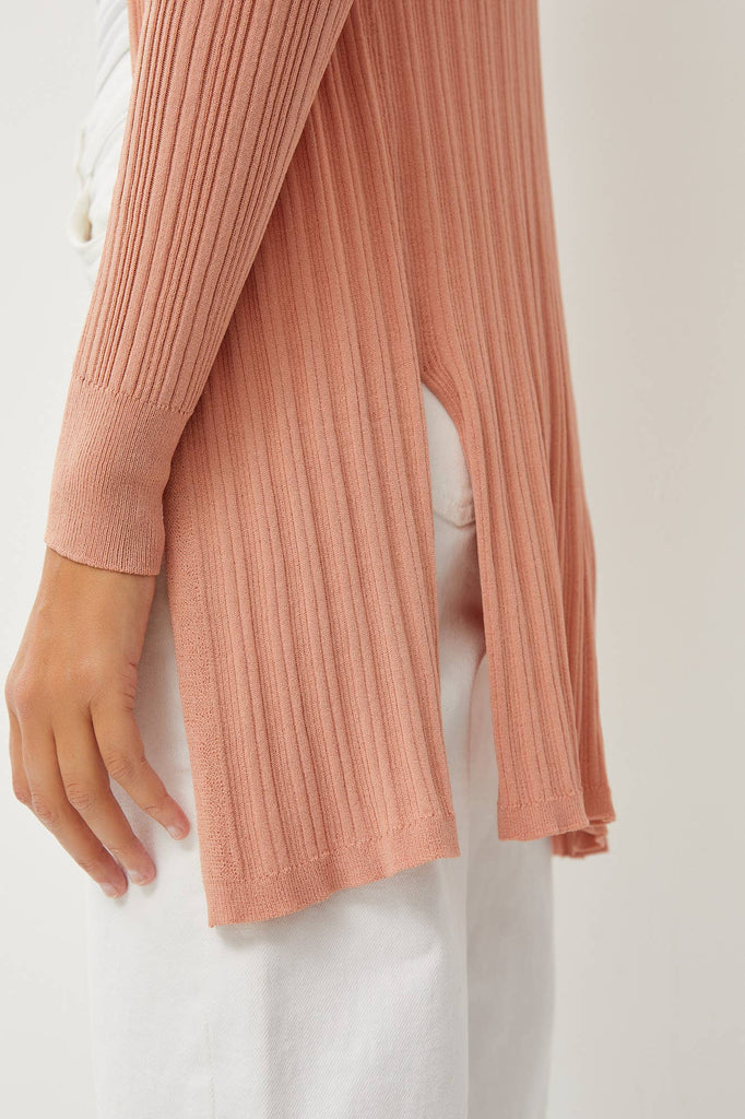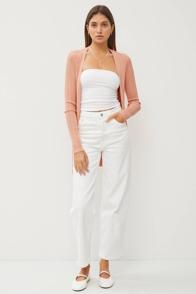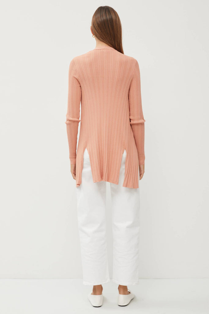 Stay effortlessly stylish in this lightweight open-front cardigan, designed for breezy layering. Crafted from a soft ribbed knit, it features a flattering fitted silhouette with long sleeves, subtle back slits, and a modern split hem. Falling just below the hips, it's the perfect throw-on-and-go piece for transitional weather or cool summer nights.