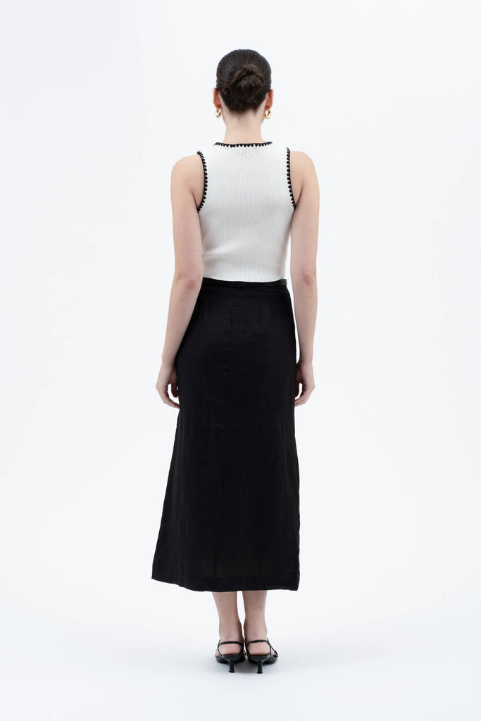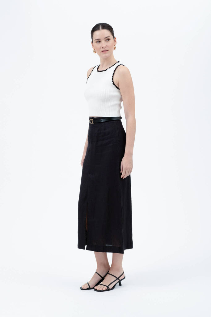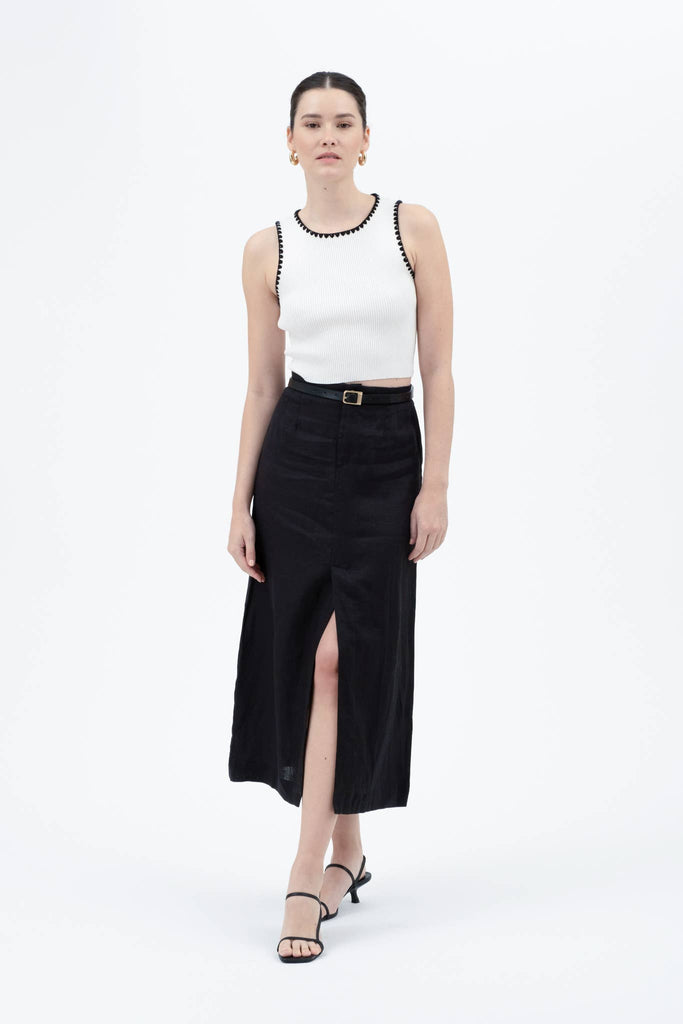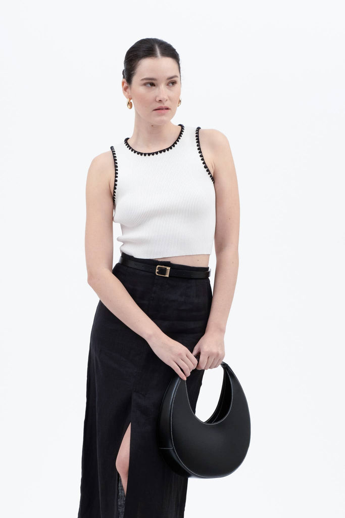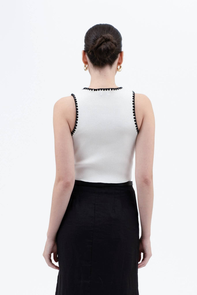 Chic and effortlessly stylish, this sleeveless sweater tank features a classic round neckline and striking black scallop trim that pops against the crisp white knit. The cropped silhouette adds a modern touch, making it perfect for layering or wearing on its own. Crafted from a soft and stretchy blend of 70% viscose and 30% polyester for a flattering fit that feels as good as it looks.